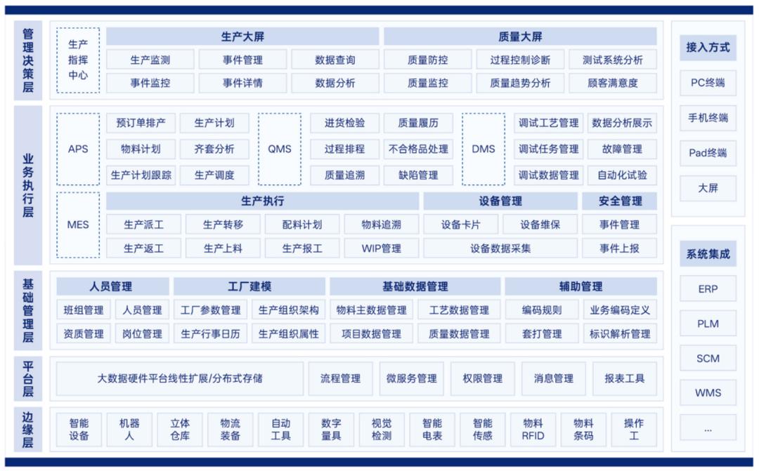智能设备、机器人、立体仓库、RFID等硬件联网,实时采集设备状态、物料流转、能耗数据,为上层决策提供 “一手情报”。
